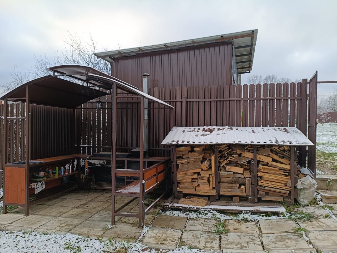 Снаружи — уютное пространство на веранде, зона отдыха со столом и мангальная зона.