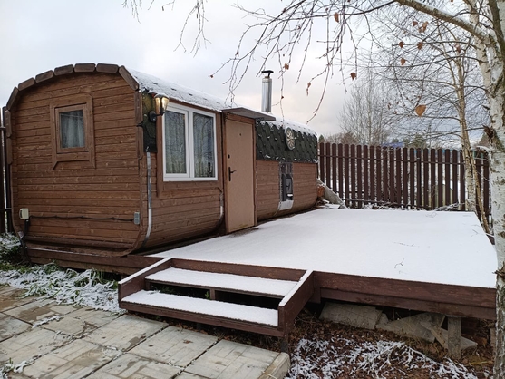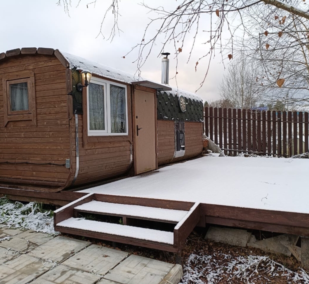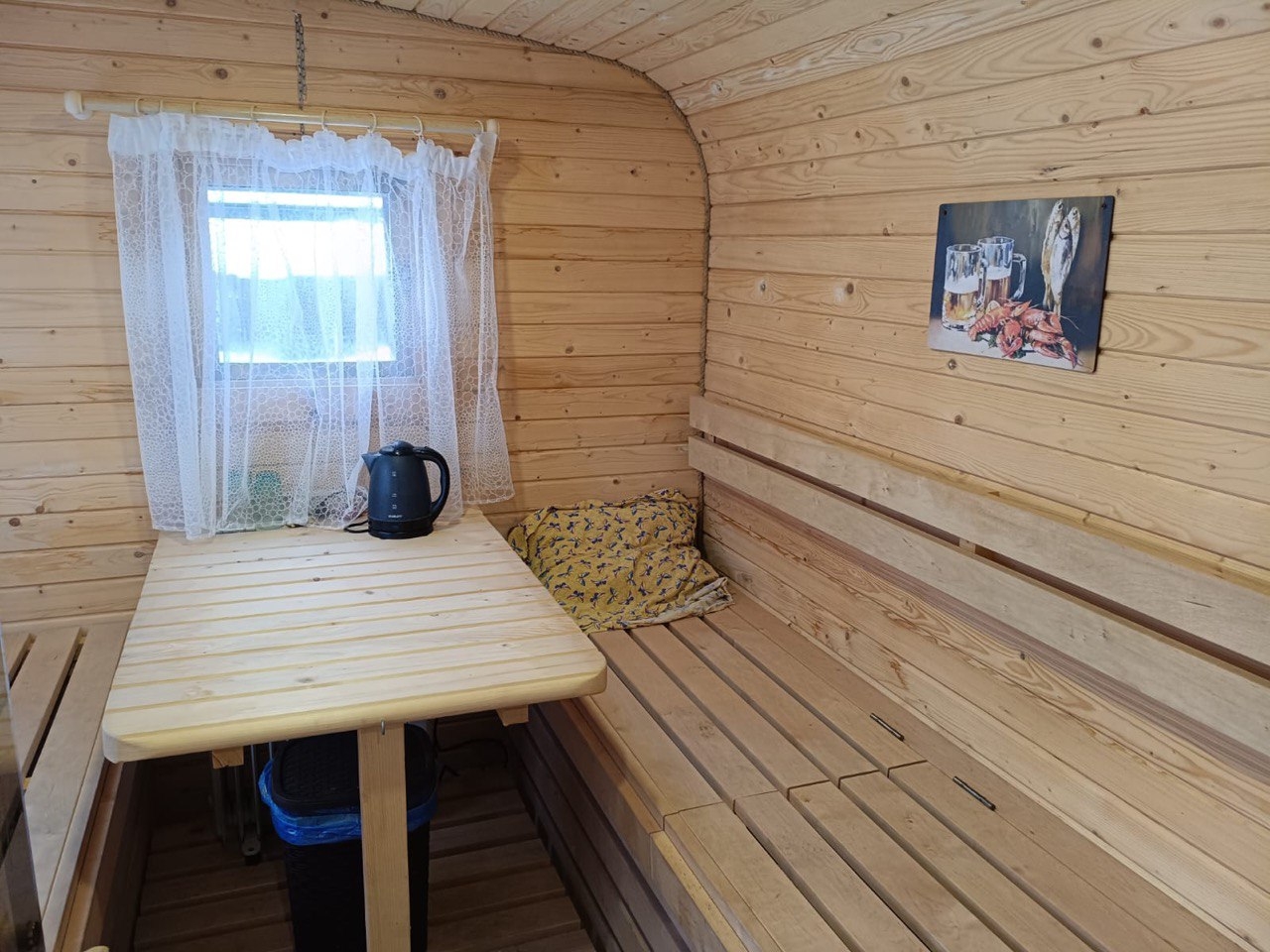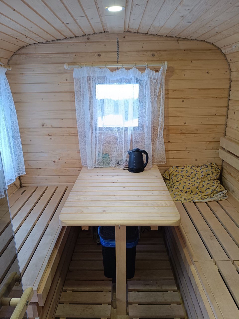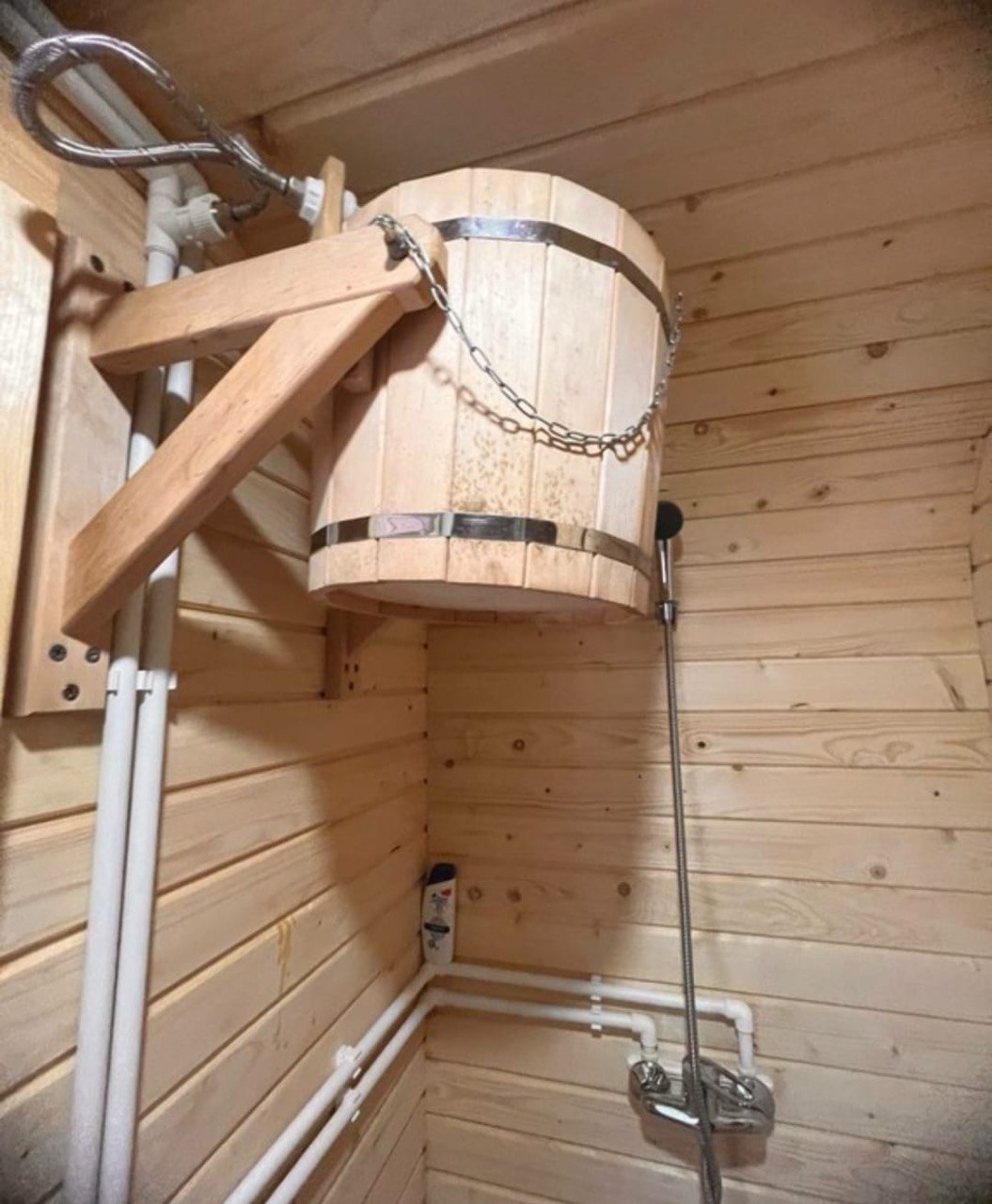 Внутри бани — предбанник для переодевания и зона отдыха, душевая, просторная парная, ведерко для обливаний и закаливания.